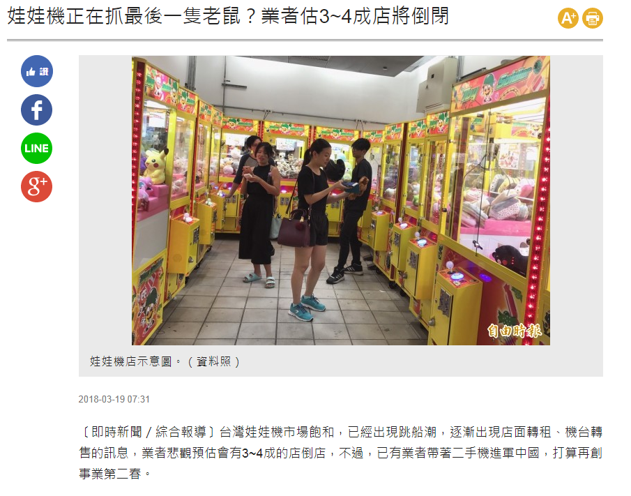 夾娃娃機在短短的五六個月的時間占滿了台灣大街小巷